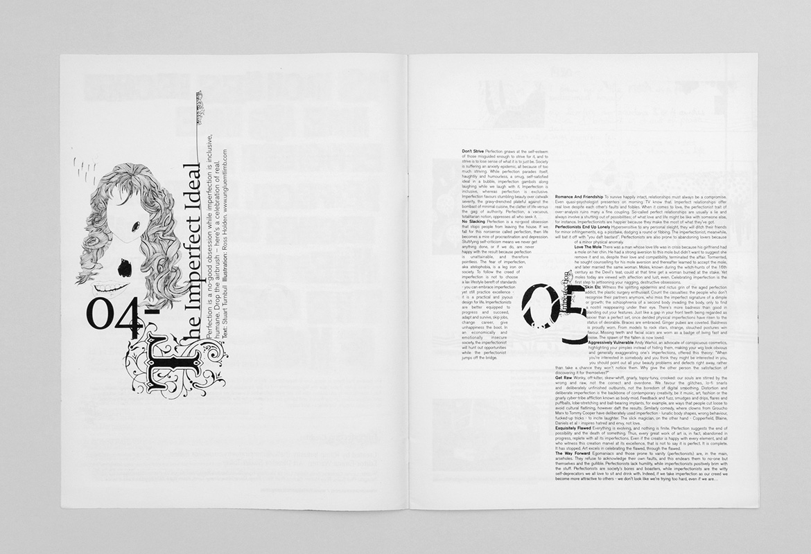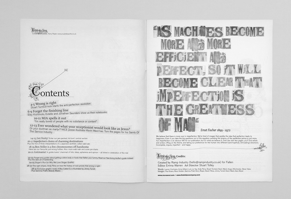 Fallen Vodka was created by Glenmorangie to offer an alternative perspective to mainstream vodka brands, that typically communicate a sense of product purity. Imperfection newspaper magazine was created to publicise the launch of Fallen Vodka, by celebrating the idea of imperfection, with the strap line ‘there’s more soul in imperfection.’